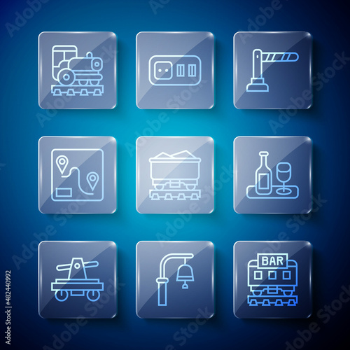 Set line Draisine or handcar, Train station bell, Restaurant train, Railway barrier, Coal wagon, Route location, Vintage locomotive and Wine bottle with glass icon. Vector