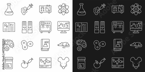 laboratory, experimental, rat, animal, research, science, deoxyribonucleic acid, engineering, medicine, laboratory, vector, icon, isolated, set, line, linear, contour, outline, black, white, chemistry, analysis, glove, rubber, hand, medicals, clinical, record, flask, beaker, glasses, box, experiment, equipment, gmo, genetic, genetically, biology, book, molecular, infection, microbe, mobile phone, microbiology, human, fruit, food, healthy, health