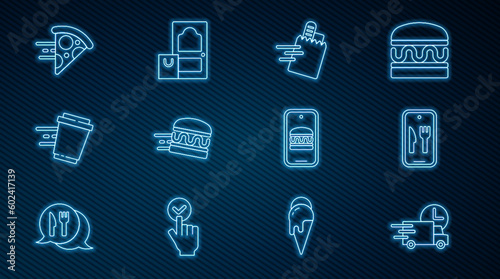service, food, business, car, delivery, order, fast, online, vector, illustration, icon, isolated, set, line, linear, contour, outline, neon, glowing, light, flat, cyberspace, phone, mobile, burger, hamburger, cup, hot drink, drink, paper, pizza, slice, italian, cheese, sandwich, cheeseburger, eatery, hand, door, concept, courier, background, cream, dessert, waffle, cone, cafes, location, pin