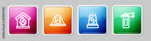 Set line Fire in burning house, Firefighter helmet, Flasher siren and extinguisher. Colorful square button. Vector