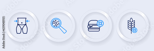 Set line Gluten free grain, No burger, GMO and Women waist icon. Vector