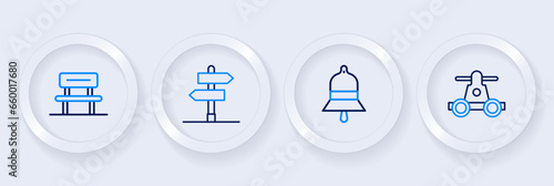 Set line Handcar transportation, Train station bell, Road traffic sign and Waiting hall icon. Vector