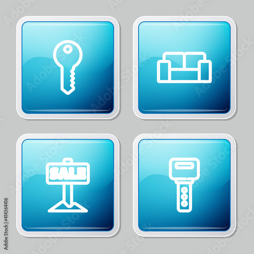 Set line House key, Sofa, Hanging sign with Sale and icon. Vector.