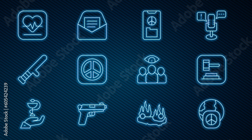 earth, signs, international, day, cyberspace, justice, law, crime, peaceful, flower child, vector, icon, isolated, set, line, linear, contour, outline, neon, glowing, light, symbol, illustration, love, baton, rubber, guard, rate, heartbeat, pulse, health, detective, spy, secret, hat, message, web, envelope, electronic mail, car, man, fuel, fire, snake, medicals, medicine