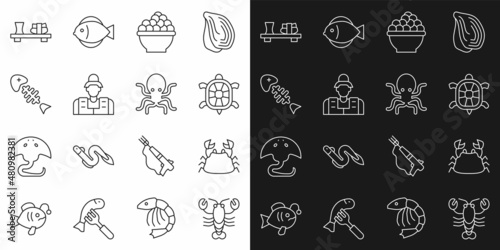 Set line Lobster, Crab, Turtle, Caviar, Fisherman, skeleton, Sushi cutting board and Octopus icon. Vector