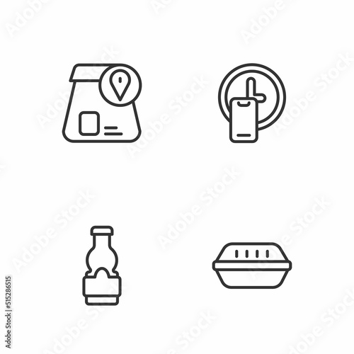 Set line Lunch box, Sauce bottle, Online ordering food and Round the clock delivery icon. Vector