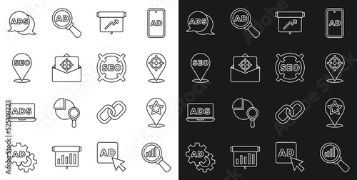 Set line Magnifying glass and analysis, Map pointer with star, Target sport, Board graph chart, Mail e-mail, SEO optimization, Advertising and icon. Vector