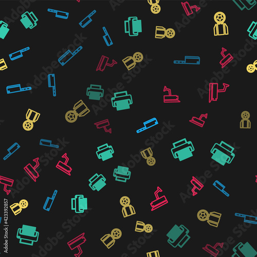 Set line Meat chopper, Printer, Medal with star and Security camera on seamless pattern. Vector