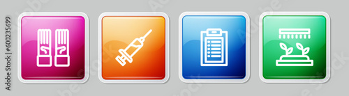 Set line Medical rubber gloves, Syringe, Clinical record and Automatic irrigation sprinklers. Colorful square button. Vector