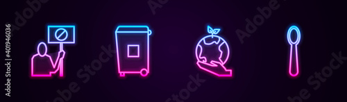 Set line Nature saving protest, Trash can, Hand holding Earth globe and Disposable plastic spoon. Glowing neon icon. Vector.