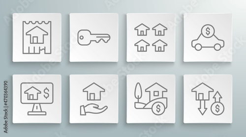 Set line Online real estate, House key, Realtor, with dollar, Car rental and icon. Vector