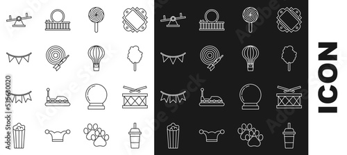 Set line Paper glass with drinking straw and water, Drum drum sticks, Cotton candy, Lollipop, Classic dart board arrow, Carnival garland flags, Seesaw and Hot air balloon icon. Vector