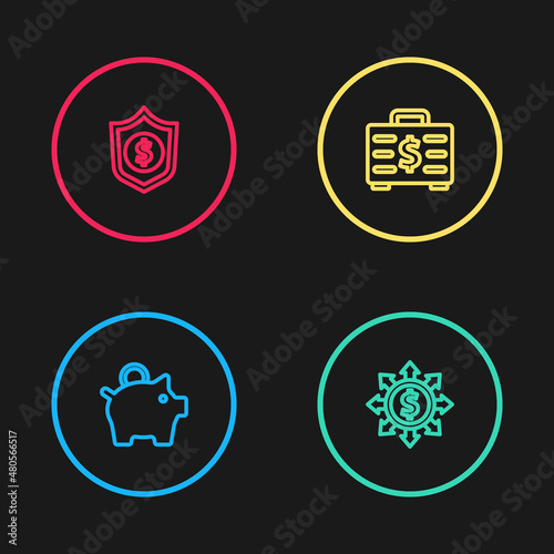 Set line Piggy bank, Dollar, share, network, Briefcase and money and Shield with dollar icon. Vector