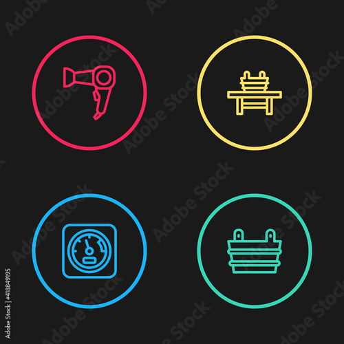 Set line Sauna thermometer, bucket, bench with and Hair dryer icon. Vector.