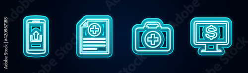 Set line Smartphone with upload, Clinical record, First aid kit and Monitor dollar. Glowing neon icon. Vector