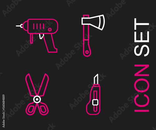 Set line Stationery knife, Scissors, Wooden axe and Electric drill machine icon. Vector