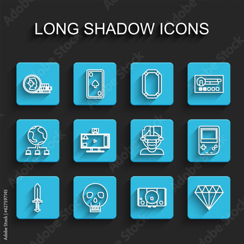 Set line Sword for game, Skull, Coin, Video console, Diamond, Live streaming online, Portable video and Virtual reality glasses icon. Vector