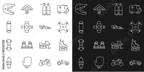 Set line Vintage sport racing car, Skates, Drone flying, Aqualung, Knee pads, Skateboard trick, Motocross motorcycle helmet and Formula 1 icon. Vector