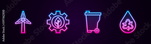 Set line Wind turbine, Leaf plant gear machine, Trash can and Recycle clean aqua. Glowing neon icon. Vector.