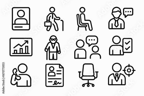 Set of 12 black job and office icons in flat vector style with white background, perfect for career apps, employment platforms, and HR projects.