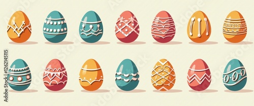 easter, egg, decorated, colourful, holiday, spring, celebration, vector, illustration, pattern, design, graphic, background, banner, website, marketing, greeting, card, invitation, orange, teal, red, yellow, pastel, festive, traditional, ornate, collection, set, cute, simple, seasonal, event, religion, christian, art, digital