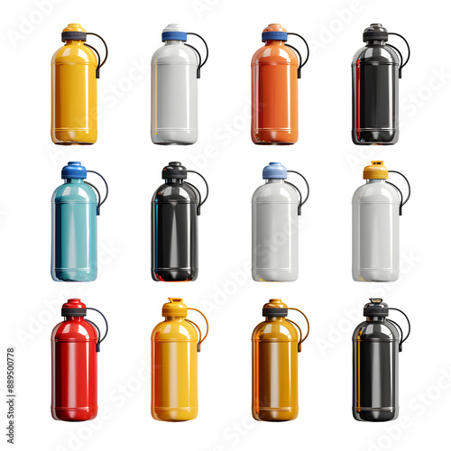 Set of 12 Colorful Water Bottles with Black Caps and Handles.