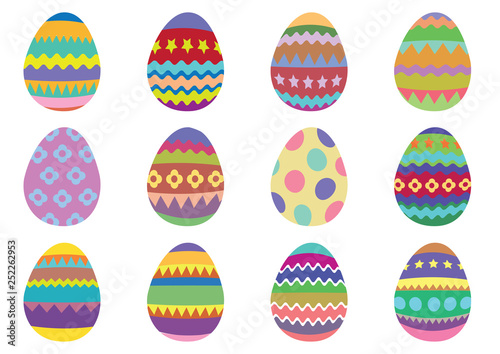 Set of 12 colourful Easter eggs on a white background.