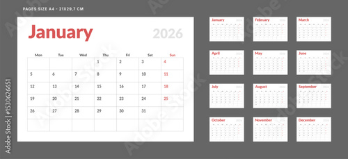calendar, 2026, year, template, planner, layout, grid, wall, month, weekly, jan, simple, english, business, vector, design, date, schedule, february, march, april, may, june, july, august, september, october, november, december, week, agenda, basic, number, day, 12, monday, note, section, print, grey, red, typography, table, corporate, company, office, monthly