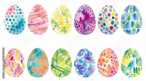 Set of 12 vibrant watercolor Easter eggs with abstract patterns, perfect for spring holiday designs and festive decorations