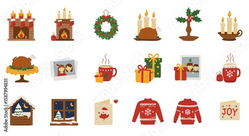 Set of 15 Cozy Christmas and Winter Tradition Icons Flat Style