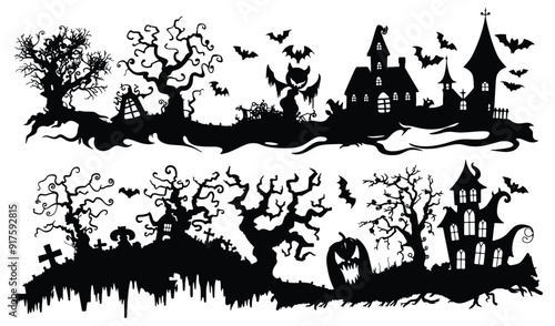 Set of 2 isolated Halloween decorations in silhouette illustration style of Jack o'lantern, bat, haunted house and tree and graveyard on transparent background. Volume 5.