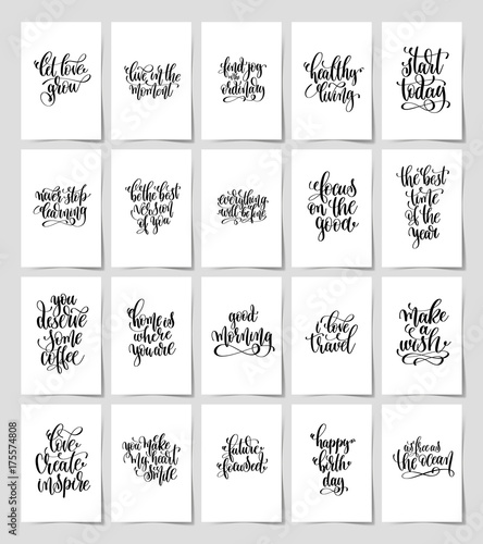 set of 20 black and white hand lettering magic quotes posters, inspirational positive phrase, calligraphy vector illustration collection