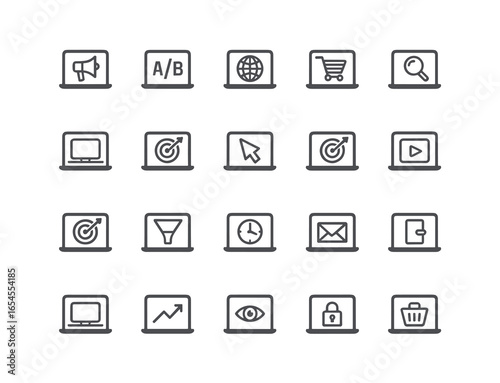 business, icon, set, collection, online, cyberspace, technology, website, search engine optimization, datum, growth, strategy, advertising, promotion, electronic mail, communication, e-business, shopping cart, sale, conversion, funnel, target, goal, performance, analysis, time, clock, cursor, click, video, lock, security, privacy, eye, view, laptop, computer, graphic, symbol, outline, minimalist, line art, white background