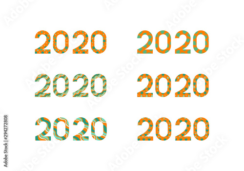 Set of 2020 inscriptions. Lettering with seamless patterns inside. Decoration with dots, waves, stars and heart shapes. Vector illustration.