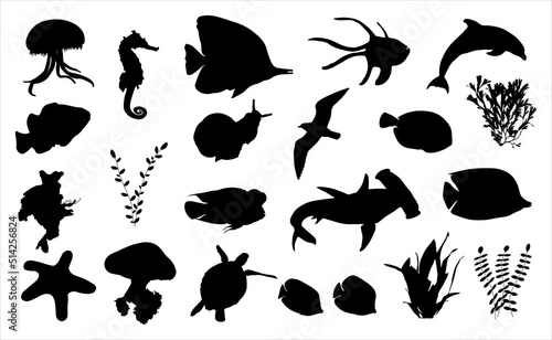 vector, silhouette, set, illustration, nature, design, fish, collection, sea, sun, bird, silhouette, white, turtle, ocean, jellyfish, seaweed, gull, dolphin, snail, lake