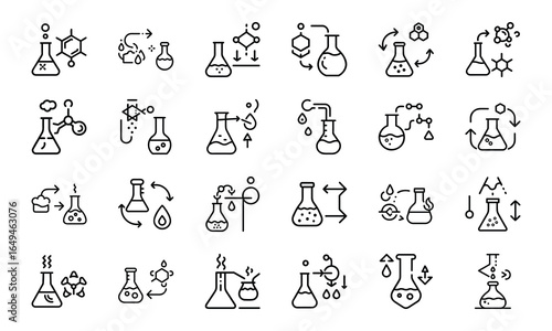 Set of 24 Science and Laboratory Line Icons Chemistry, Biology, Physics, Research, Safety, and Technology Symbols in Minimal Outline Style