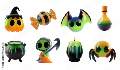 Set of 3d horror and cute Halloween isolated illustration design elements icon set, pumpkin pot bat ghost spider cat candy