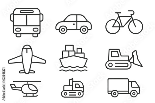 Set of 4 linear style transport icons for web and mobile app design, featuring public transport, vehicles, delivery symbols, bicycle, car, bus, train, plane, and bike illustrations