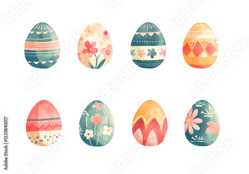 Set of 8 Easter eggs illustration. Design element watercolor illustration. Patterns. Transparent background. Colors yellow, red, pink, orange, blue, green, decoration illustration egg in spring, png