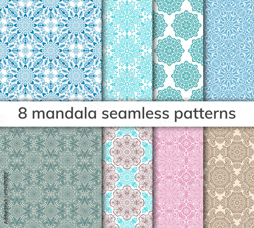 Set of 8 patterns. Collection arabic, indian, japanese, islamic motifs. Mandala seamless pattern.