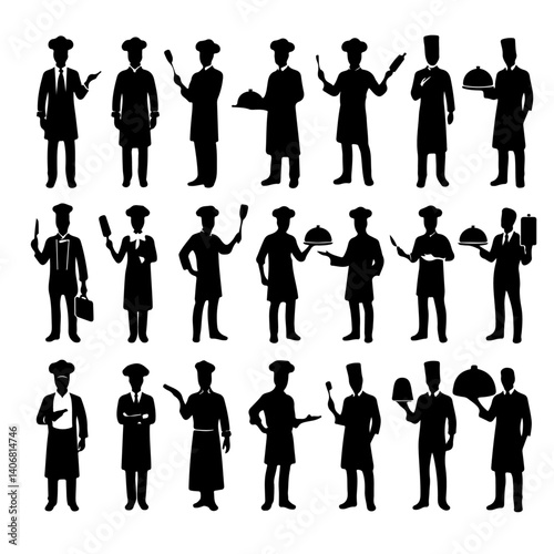 chef, silhouette, cooking, chef's hat, person, illustration, vector, man, standing, woman, outline, hat, male, clip art, food, cut-out, occupation, apron, holding, isolated, adult, white background, black-and-white, profession, professional, signs, uniform, work, business, female, happy, kitchen, plate, portrait, black, character, design, eatery, symbol, elegant, gesticulate, job, mascot, posture, working, arms crossed