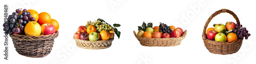 set of A basket of fresh apples, oranges and grapes, A fruit basket of apples, oranges and, grapes, A basket filled with fresh apples, oranges and grapes, on a transparent backgrounds