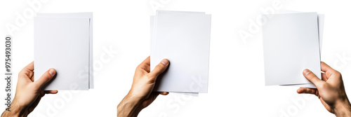 set of A hand holding a blank sheet of paper, isolated against on a transparent background