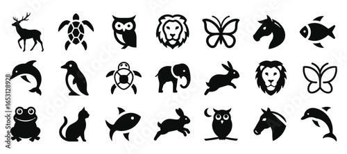 animal, silhouette, icon, vector, wildlife, nature, creature, fish, bird, insect, mammal, reptile, amphibian, frog, butterfly, cat, horse, lion, turtle, cervid, owl, dolphin, penguin, elephant, rabbit, pet, zoo, graphic, illustration, design, symbol, shape, black, collection, set, creative, art, template, outline, logotype, abstract