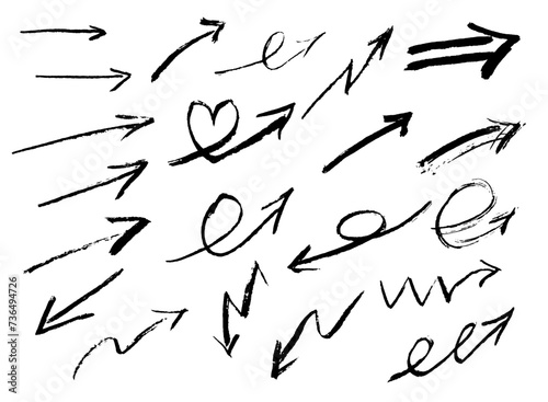 Set of arrows drawn by hand. Pencil strokes. Brushes of different shapes on a black background. Vector brushes in grunge style. Vector horizontal lines in pencil. Vector lines coal, drawn by hand.