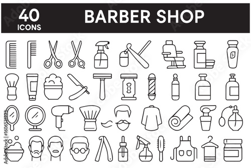 Set of barbershop essentials icons for hairstyling, grooming, and haircuts Includes scissors, comb, razor, and more for barbershop design beauty salon hair cutting concept