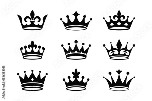 Set of black and white crown illustrations in various styles for design projects