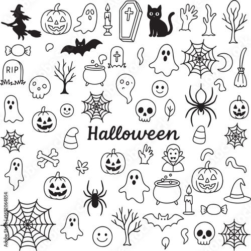 halloween, doodle, line art, black-and-white, spider, web, pumpkin, ghost, sorcerer, broom, bat, skull, gravestone, cat, cauldron, creepy, skittish, scarey, horror, festival, autumn, fall, holiday, children, cute, cartoon, illustration, hand-drawn, outline, drawing, vignetting, trick or treat, monster, candle, haunted, skeleton, vampire, zombie, magic, potion, spider's web, celebration, october, party