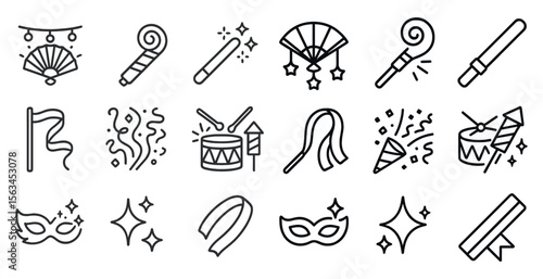 Set of black and white icons for various party decorations. The icons include a fan, a drum, a mask, and a stick