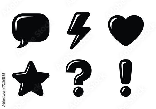 Set of black glossy icons: speech bubble, lightning, heart, star, question mark, exclamation point.